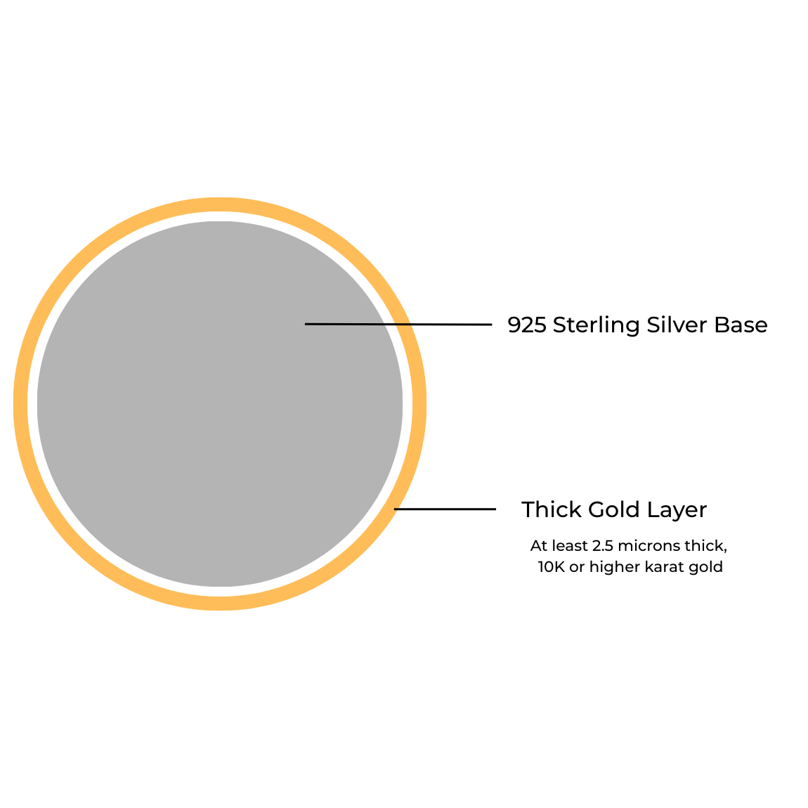 Gold vermeil uses Sterling Silver as a base metal, this means your jewelry is made from only precious metals. Sterling Silver consists of 92.5% pure silver and 7.5% other materials like brass or copper. A thick layer of gold is then electroplated over the sterling silver base.
